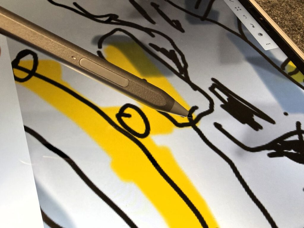 Also schnell Sketchbook installiert und losgelegt. Der Stift reagiert gut auf Eingaben, ermöglicht eine ordentliche Linienführung und vermittelt ein solides Schreibgefühl. Alles nicht ganz auf dem Niveau eines iPad oder eines Samsung S8 Ultras, aber in dieser Preisklasse ziemlich zufriedenstellend. Zwar ist eine Handflächenerkennung aktiv, trotzdem fabriziert der Stift gelegentlich seltsame und vor allem ungewollte Punkte oder Striche auf dem Schirm. Wie eine Art von Geistereingabe – die man hoffentlich rechtzeitig bemerkt und rückgängig machen kann. Auch sitzt der Strich nicht so präzise wie bei manchen Mitbewerber, doch nach kurzer Zeit hat das Hirn diesen kleinen Verzug berücksichtigt.