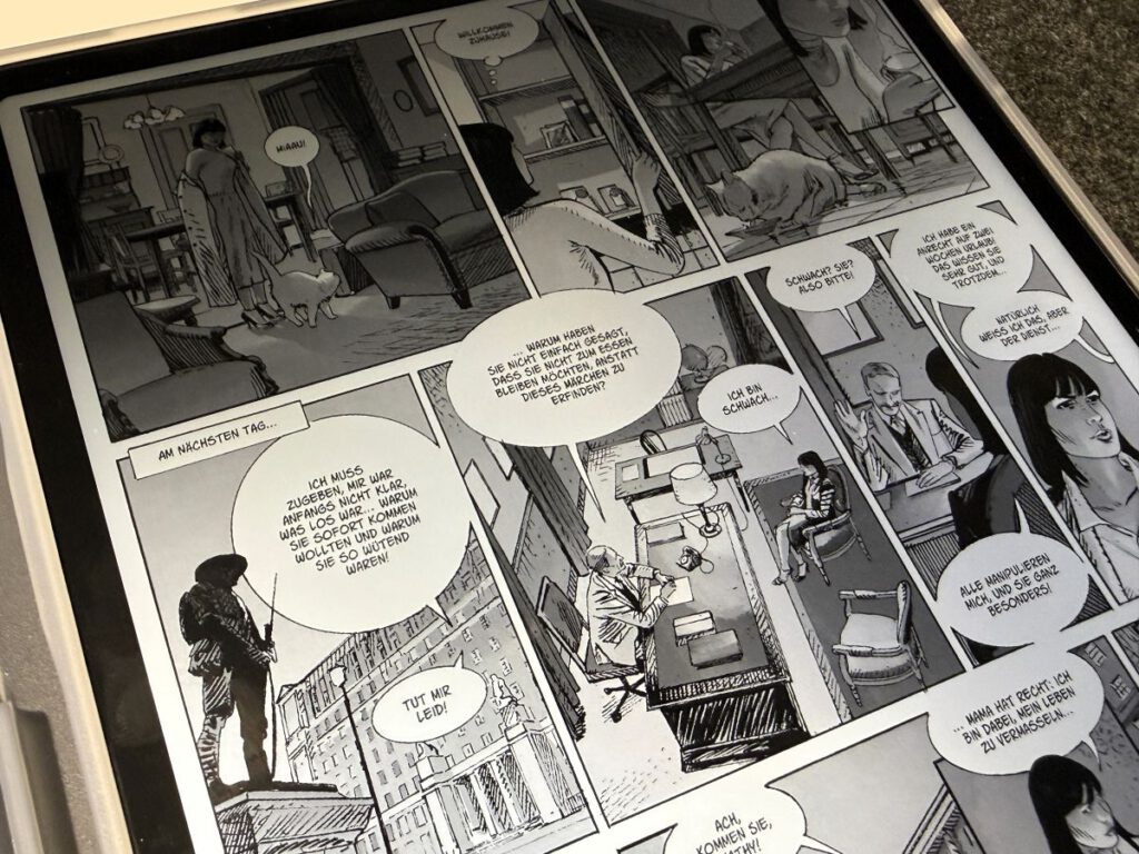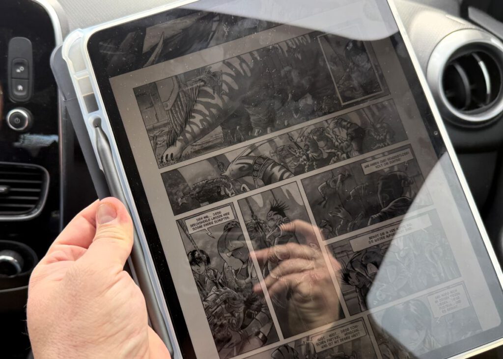 In den letzten Tagen ist das Tablet zu meinem treuen Begleiter geworden und mein vorläufiges Fazit fällt trotz einiger Kritikpunkte recht positiv aus. Auch wenn das Display etwas heller sein könnte und weniger spiegeln dürfte (hierfür gibt es aber Folien), gefällt das lesefreundliche Format und die weitestgehend saubere Stifteingabe beim kreativen Betätigen. Das Lesen vom Comics macht deutlich mehr Spaß als auf einem kleinen Schirm und der optionale INK-Modus ist hier absolut empfehlenswert – auch wenn dies grundsätzlich per Software auch auf anderen Geräten möglich ist.